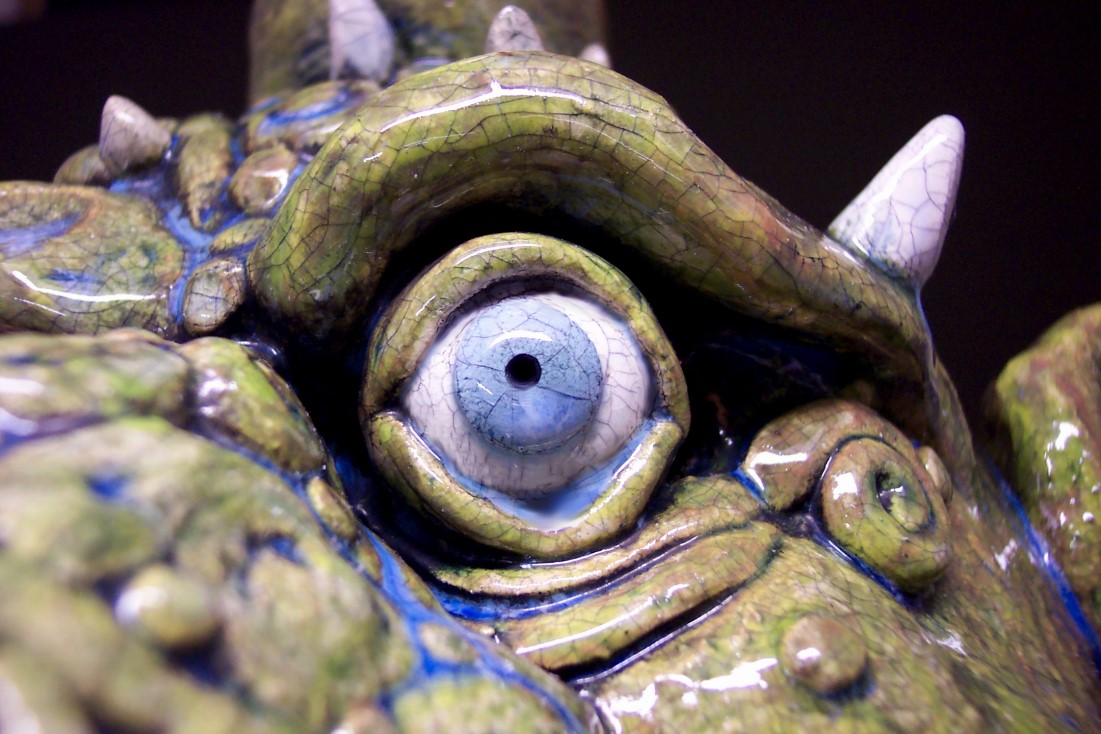 Scrumpie was thrown on the potters wheel from stoneware clay and was sculpted by hand. After several layers of slips and stains were applied he was bisqued then glazed with a clear crackle raku glaze and fired . He has lots of color, texture and and crackly goodness .